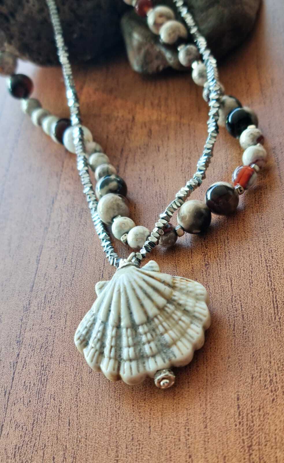 O colar Grumari é feito à mão, de forma 100% artesanal, com pedras naturais de Ágata Marrom e hematitas prata.